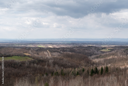 Hilly countryside during cloudy day, village with scattered houses and hills overgrown with leafless forest in March
