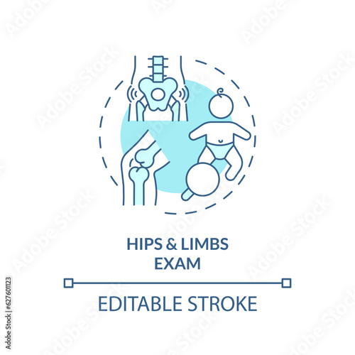 Hip and limb exam turquoise concept icon. Musculoskeletal system. Health service. Child development. Joint health abstract idea thin line illustration. Isolated outline drawing. Editable stroke