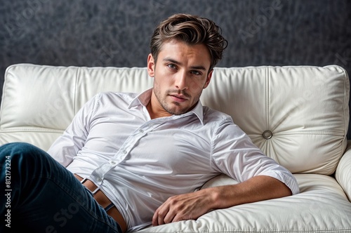 His forehead on the pillow, a smile on his face as he rests on the couch