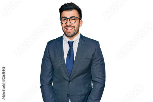 Hispanic man with beard wearing business suit and tie looking positive and happy standing and smiling with a confident smile showing teeth