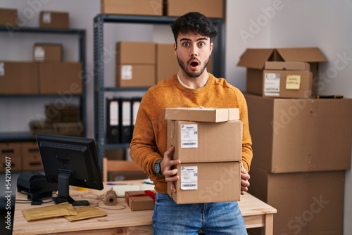 Hispanic man with beard working at small business ecommerce holding packages afraid and shocked with surprise and amazed expression, fear and excited face.