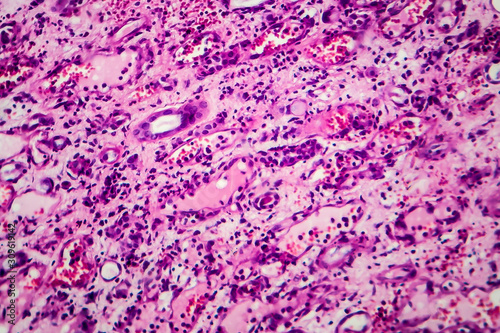 Histopathology of interstitial nephritis, light micrograph, photo under microscope