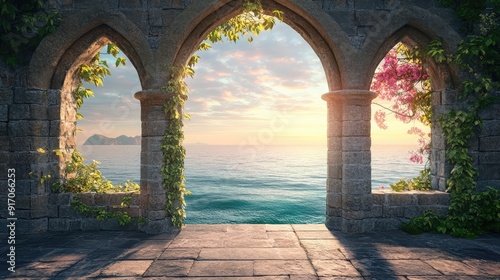Historic medieval stone arched windows with romantic view of sea or ocean, summer landscape background. Generation of Ai