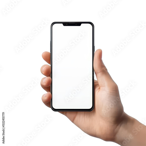 Holding a blank smartphone screen in hand against a white background, hand holding smartphone screen blank mobile on white background