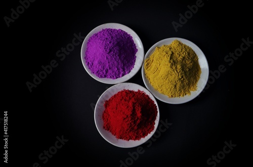 Holi Festival Colors or Gulal in Plates Isolated on Black Background with Copy Space, Perfect for Wallpaper
