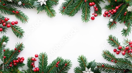 Holiday greeting card with space for text and festive fir tree and holly decoration on white background