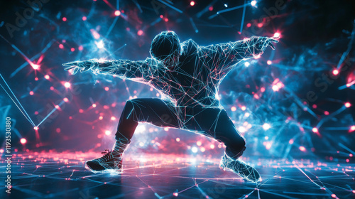 Hologram break dance. The dancer stands on his hands of polygons, triangles of points and lines. Break dance is a low poly connection structure. Technology concept.