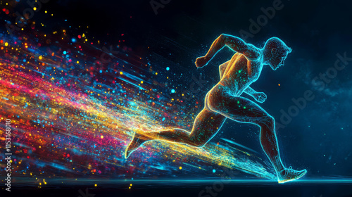 Hologram running. A man runs. Flickering energy flux of particles. The scientific design of the sport.