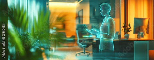 holographic AI Futuristic office scene with a holographic figure engaged in a virtual meeting, blending technology and innovation.