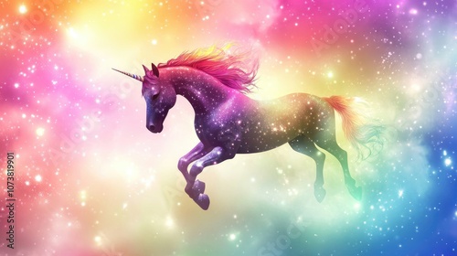 Holographic backdrop featuring a rainbow mesh design A whimsical universe theme with vibrant hues fantasy gradient elements and sparkling unicorn motifs amid stars and blurs