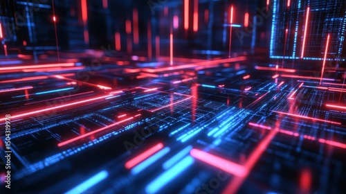 Holographic digital circuit network with red and blue neon lines, background wallpaper AI generated image