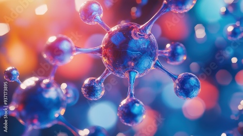 Holographic display projecting a 3D model of a molecule, sharp details, dimly lit laboratory