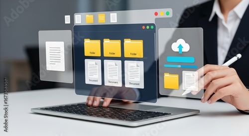 Holographic Document Management Interface Above Laptop with Folder Icons
