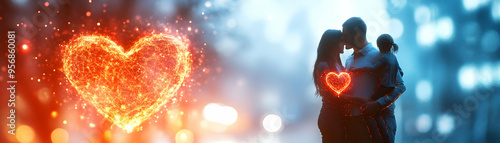 Holographic Family Embrace with Glowing Heartbeat concept as A holographic image of a family embracing with a glowing heartbeat symbol isolated on a white background with ample copy space. Representin