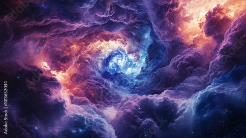 Holographic galaxy swirling with vibrant storm clouds and stars, showcasing cosmic depth in a captivating digital artwork