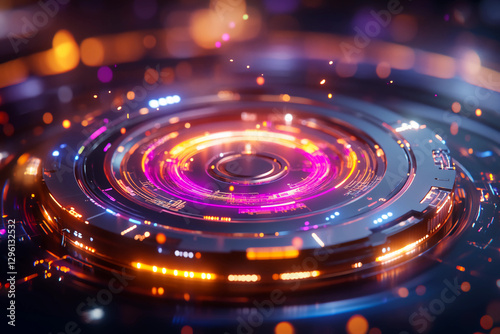 Holographic interface showing digital blueprint with glowing lines, technical details, and rotating elements in space, futuristic technology concept