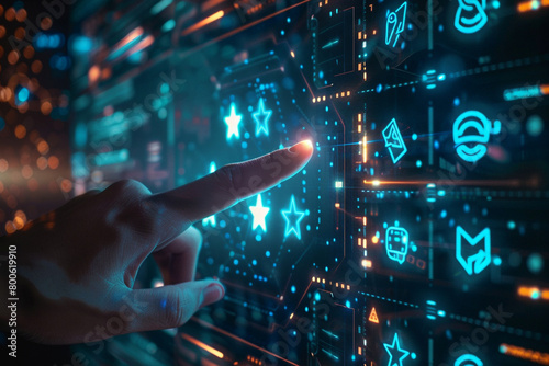 Holographic interface with a hand pointing to a five star quality rating set in a digital utopia