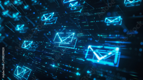 Holographic, messaging and icons with email for digital and rendering for cybersecurity, matrix or ux. Futuristic, media and innovation for information, technology and connection in AI with interface