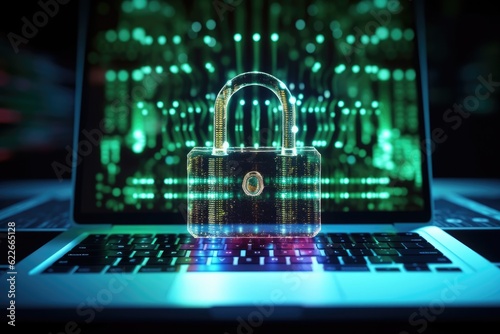holographic padlock on laptop, dark blurred background, Generative AI