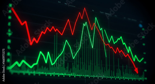 Holographic panel showing rising and falling charts, with highlighted red and green arrows, in a technological environment