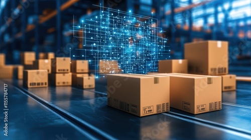 Holographic projection of complex supply chain management warehouse digital visualization industrial environment aerial view technology innovation
