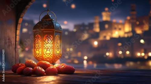 Holy month ambiance with a golden lantern casting a soft glow on dates, against a serene night sky and city bokeh.