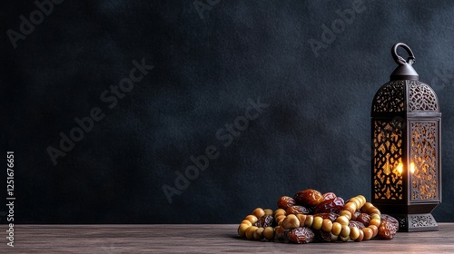 Holy Ramadan decoration with dates prayer beads and a lantern arranged elegantly for a peaceful Ramadan setting on a dark background