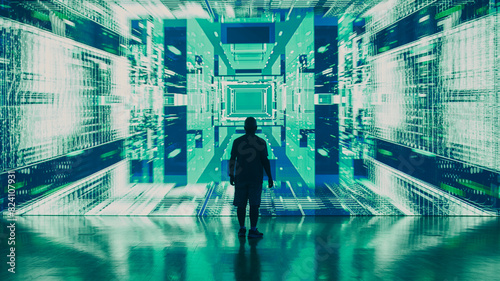 Hombre a contraluz en una luz de color intenso y brillante