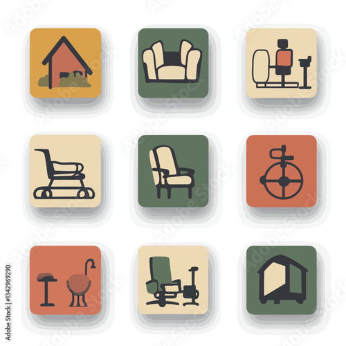 Home and Office Furniture Icons Set; Interior Design, Healthcare, Transport