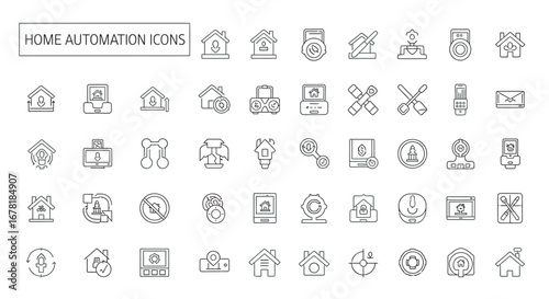Home automation system displays various smart devices and controls on a white backdrop, showcasing technological advancement and convenience.