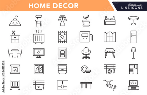 Home decor, decorations line icon set. Interior Design, Furniture, Room Layout, Lighting, Curtains, cooking, kitchen, living room, bedroom, and bathroom icon collection. UI thin outline icon pack