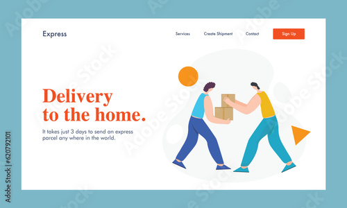 Home Delivery Based Landing Page or Hero Banner Design with Hand to Hand Parcel Delivery Through Men Illustration.