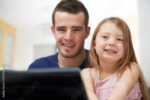 Home, father and child in portrait with tablet, educational video and streaming service for cartoon. House, dad and girl with smile for digital subscription, ebook and application for entertainment