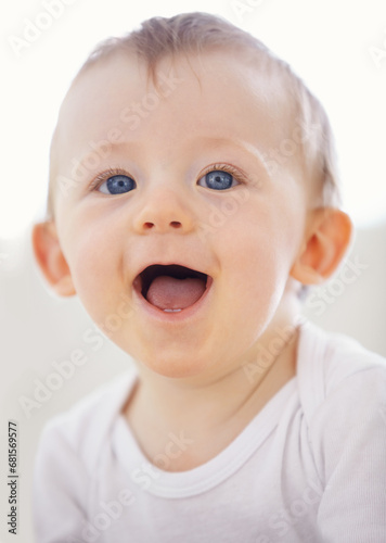 Home, happy and face of baby relax, resting and calm in nursery for sleeping or wake up in morning. Family, youth and closeup of infant newborn in bedroom for child development, growth and wellness