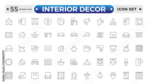 Home interior and furniture elements - thin line web icon set. Outline icons of kitchen, living room, bedroom and office collection. Simple vector illustration. Editable stroke outline icon.