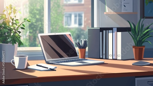 Home office workspace with a laptop and a cup of coffee on a desk.