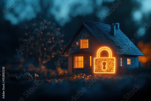 Home Security: A glowing padlock emblem overlaid on a cozy home, conveying the concepts of protection and safety in a visually striking and compelling style, against the backdrop of night.