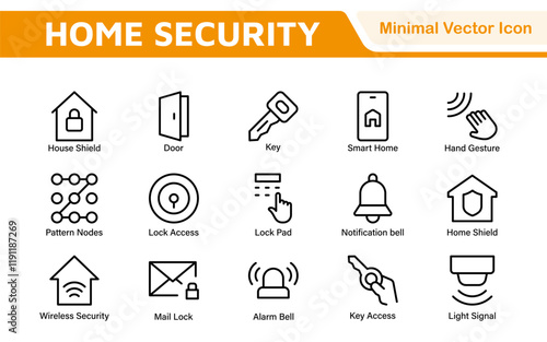 Home Security Icon Set. A comprehensive collection of icons focused on safety and protection, perfect for enhancing security apps, websites, and marketing materials aimed at home safety solutions.