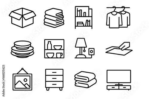 Home Unpacking Icons. Outline icon set of unpacking in new home: open box, clothes pile, bookshelf, hanging
