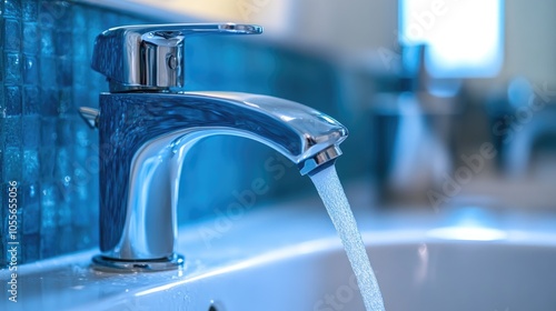 Home water conservation concept reducing usage and addressing supply issues A close up of a flowing blue faucet with a spray in a bathroom Selective focus