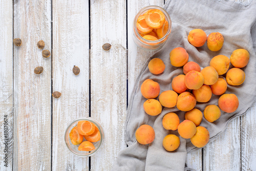 Homemade conserve of apricot pieces in glass jars/Slices of fresh apricot in glass jars and napkin on a wooden table