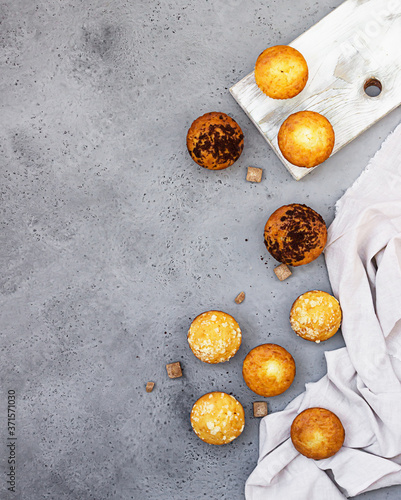 Homemade delicious muffins and muffins with crumble topping on grey background. Top view.