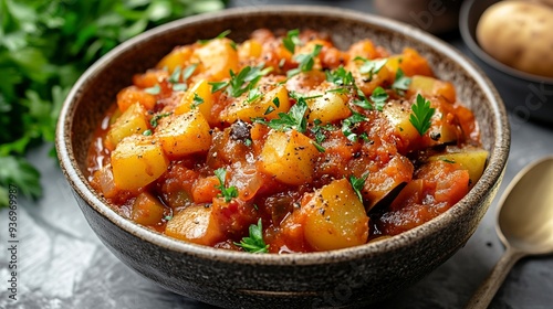 Homemade Eggplant Potato Tomato Stew with Parsley in a Bowl, side view. --ar 16:9 --v 6.1 Job ID: 49d4aa49-5369-4444-837b-56a0e6aec25d