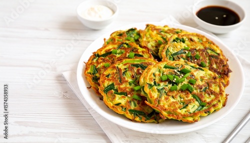 Homemade Korean Pajeon Scallion Pancake On A White Plate On A White Wooden Background, Side View.