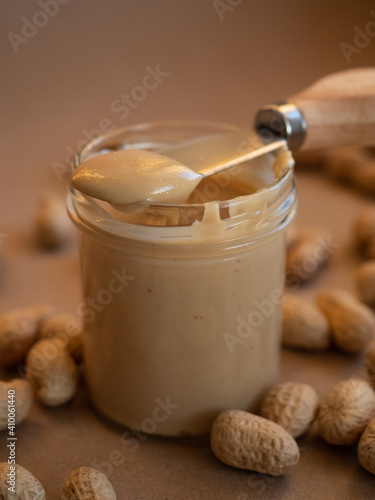 Homemade peanut butter in a glass jar with peanuts in shells scattered around on a craft background in natural light