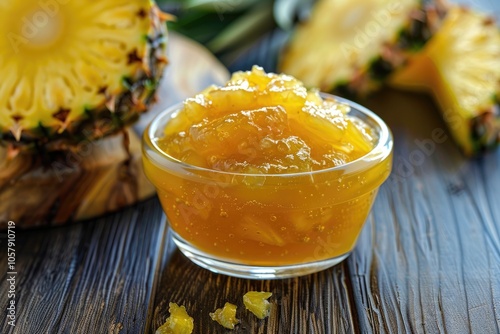 Homemade pineapple jam in glass bowl and pineapple slice with copy space