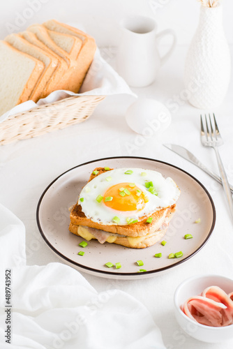Homemade sandwich - croque madame on a plate on a light table. Vertical view