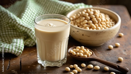 Homemade Soy Milk and Soybeans on a Wooden Surface.