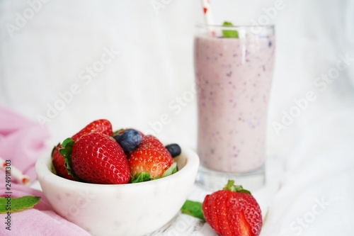 Homemade Strawberry blueberry Smoothie in a tall glass, selective focus