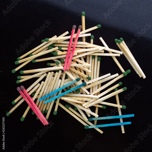 homosexuality concept: several pairs of blue and pink matches in front of a pile of ordinary matches, black background, short focus, limited lighting, toning